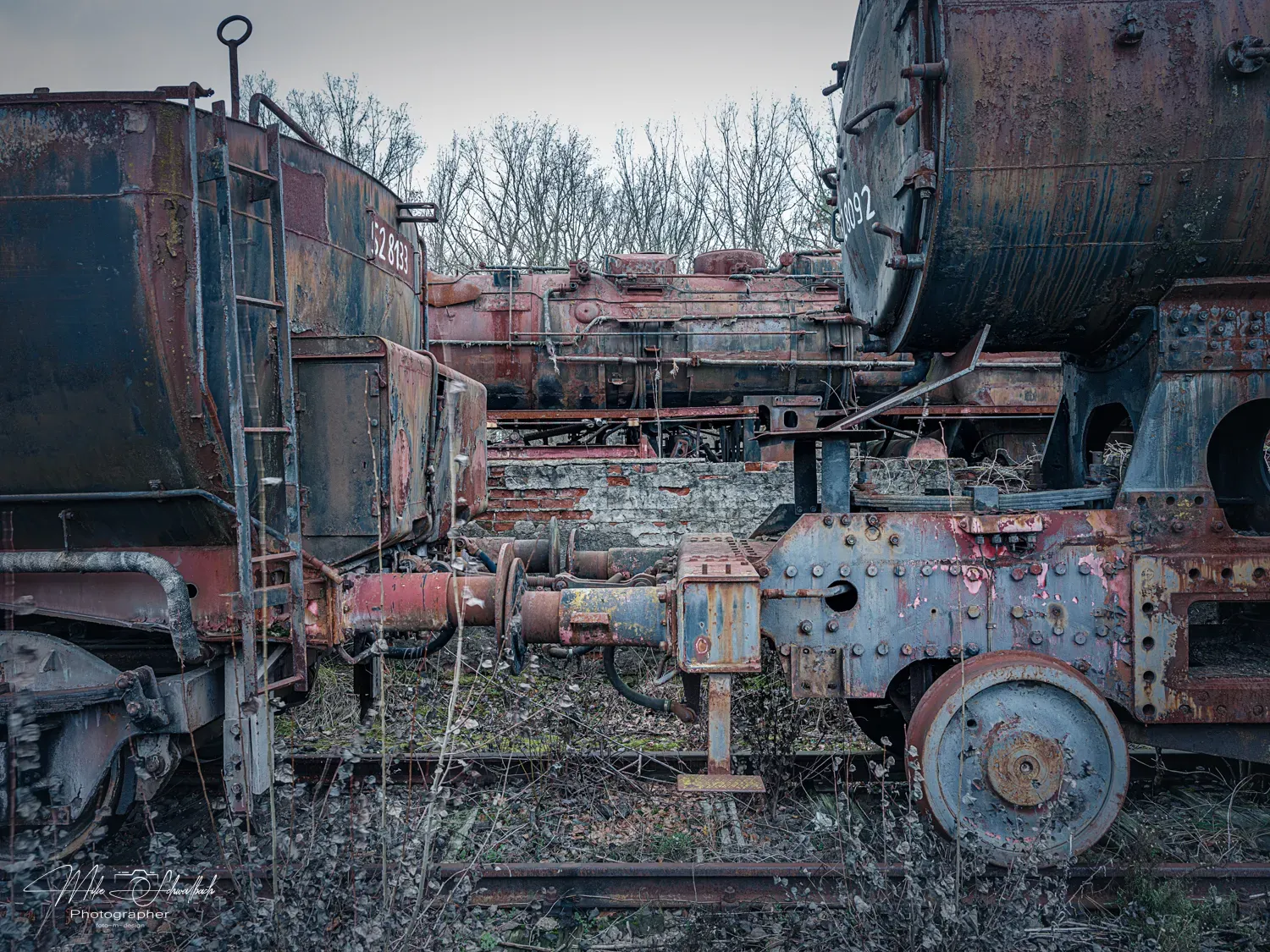 Heute befinden sich dort auf einem stillgelegten Areal zahlreiche historische Dampflokomotiven, die von der Natur umwuchert und vom Rost gezeichnet sind. Für Eisenbahnfans, Fotografen und Urban-Exploration-Begeisterte ist dieser Ort eine wahre Schatzkammer. Die mächtigen Maschinen stehen in Reih und Glied, einige noch halbwegs intakt, andere bereits stark zerfallen. Jede Lok erzählt eine eigene Geschichte – von den harten Zeiten des Bahnbetriebs bis zum langsamen Verfall, den sie nun durchlaufen.